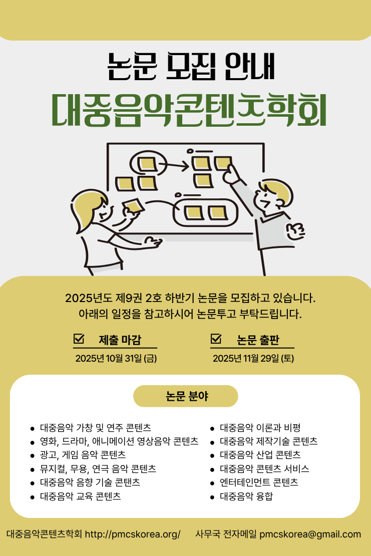 대중음악콘텐츠학회가 하반기 논문을 모집하오니 여러분의 많은 참여를 부탁드립니다.