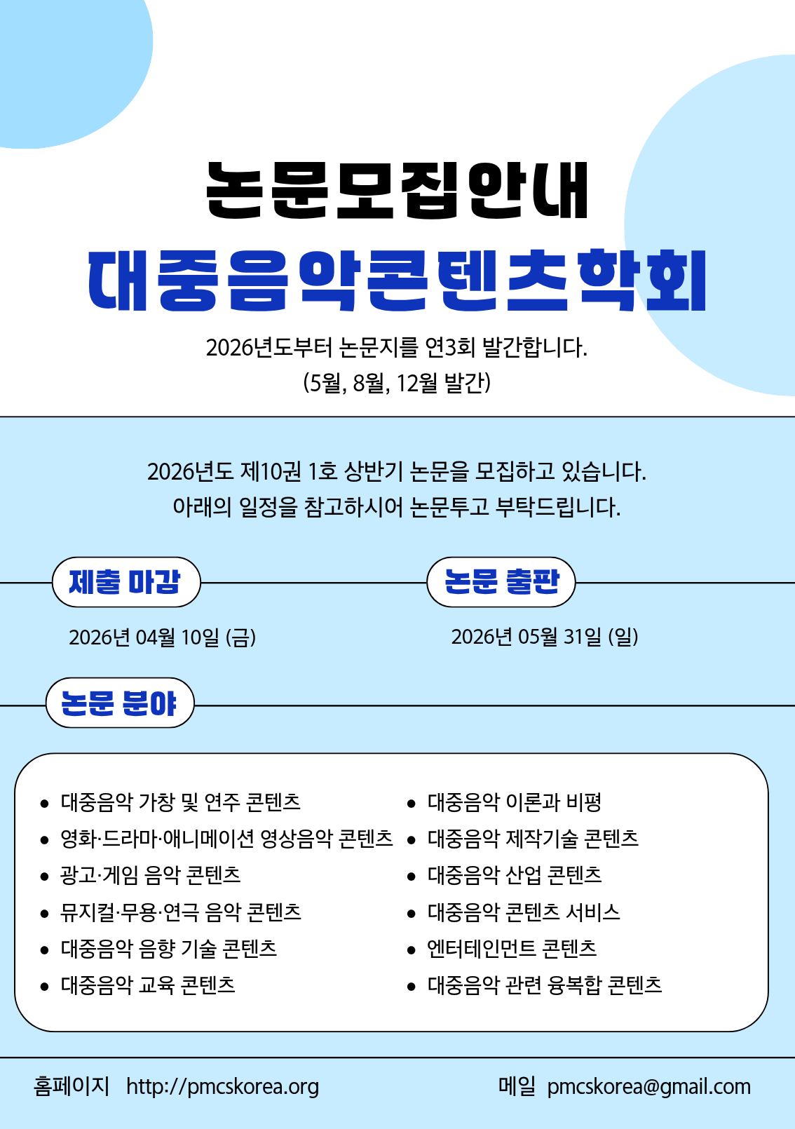 | 『대중음악콘텐츠』 제10권 1호 논문 모집 안내 (~4/10 마감) | ||