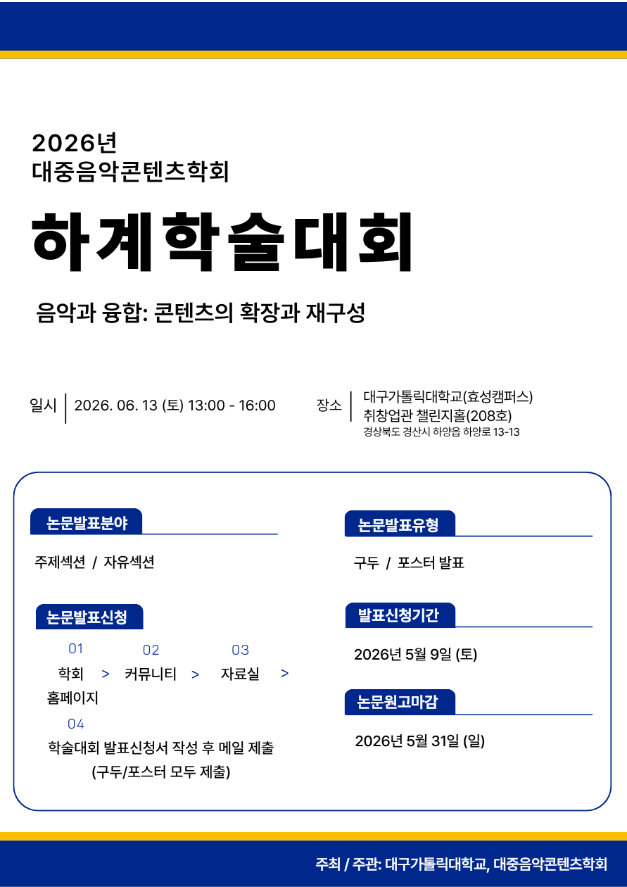 | 2026 대중음악콘텐츠학회 하계학술대회 발표 신청 및 원고 모집 안내 | ||